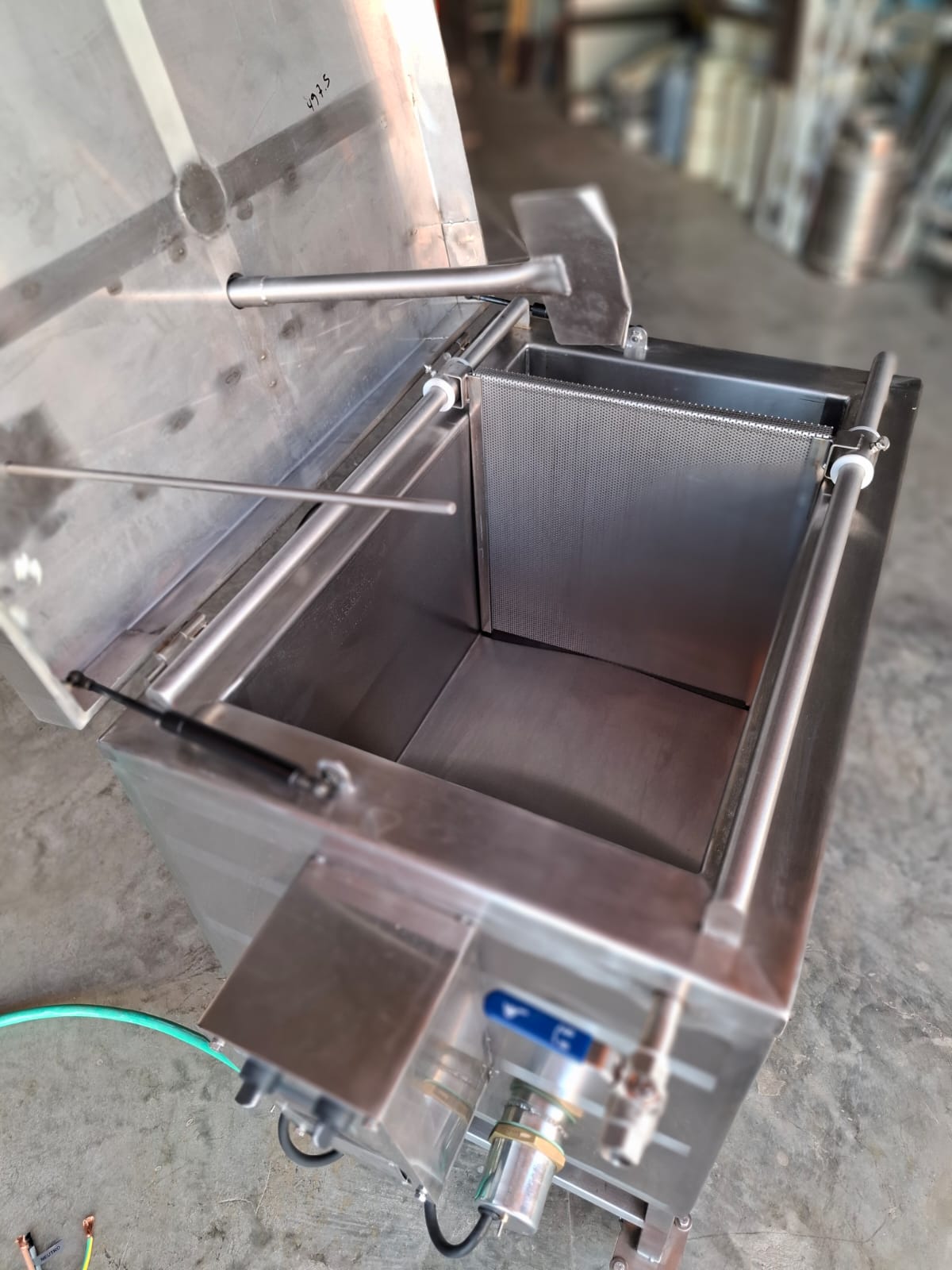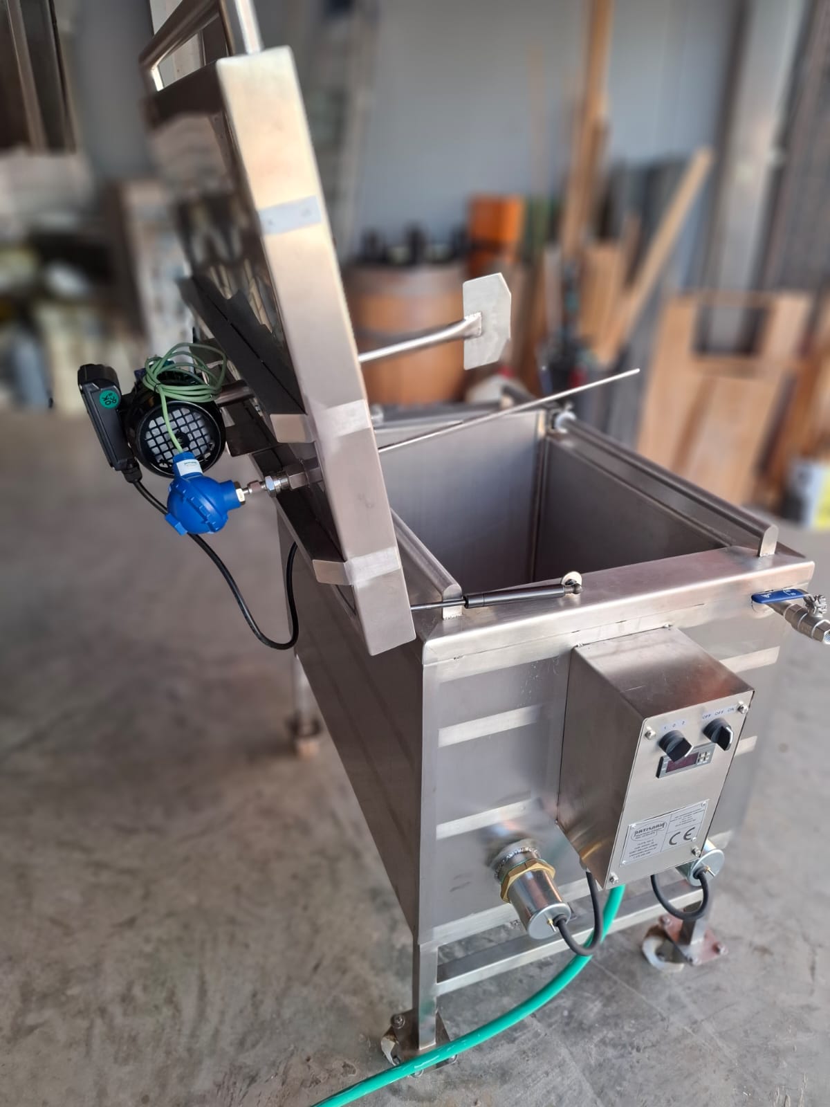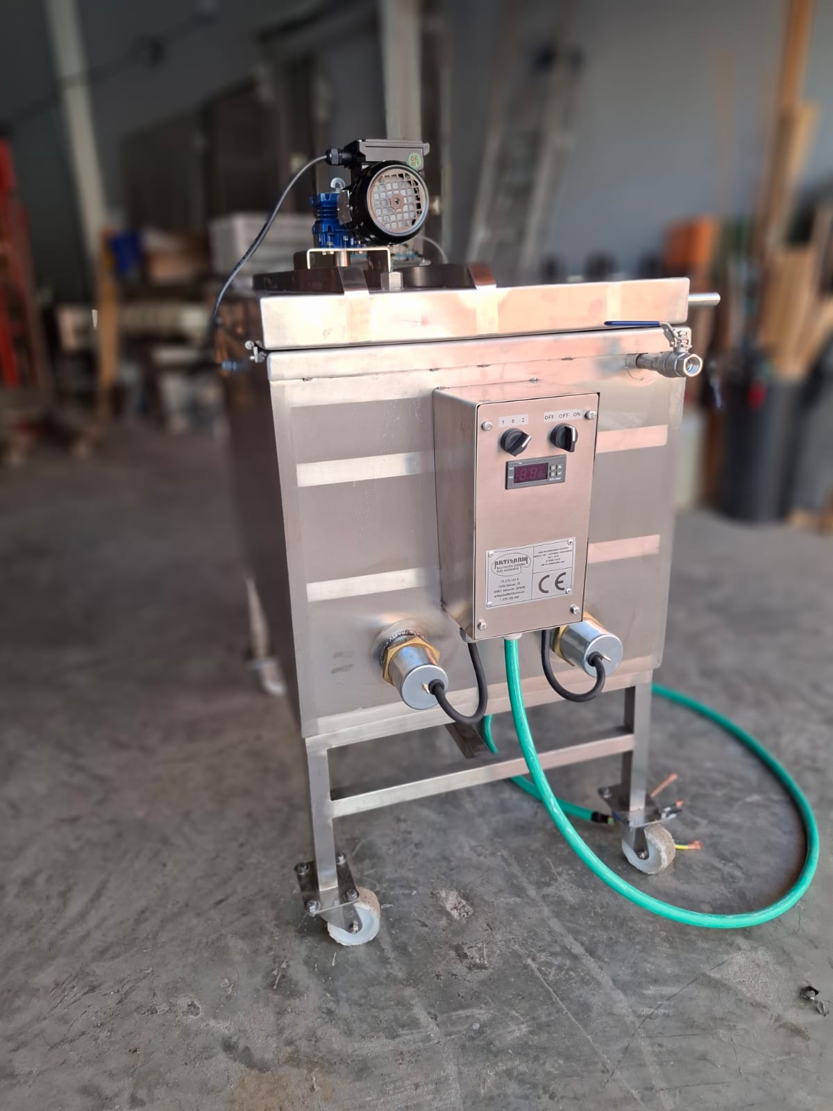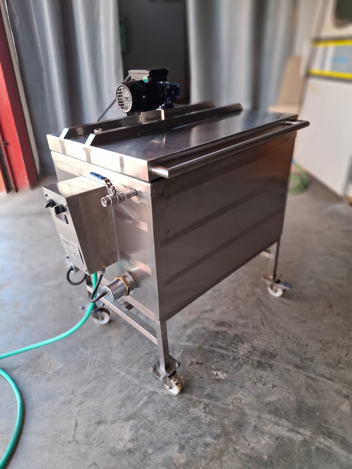 Cuba para pasteurizado fabricada en acero inox 304, con aislamiento, calentamiento al baño maría mediante 2 resistencias eléctricas, tapa con asa, lira de corte, pala y chapa preescurrido, aislamiento térmico, válvula mariposa en inox, caja de control de temperatura. Opcionales: ruedas 80 mm, motor-agitador en tapa.